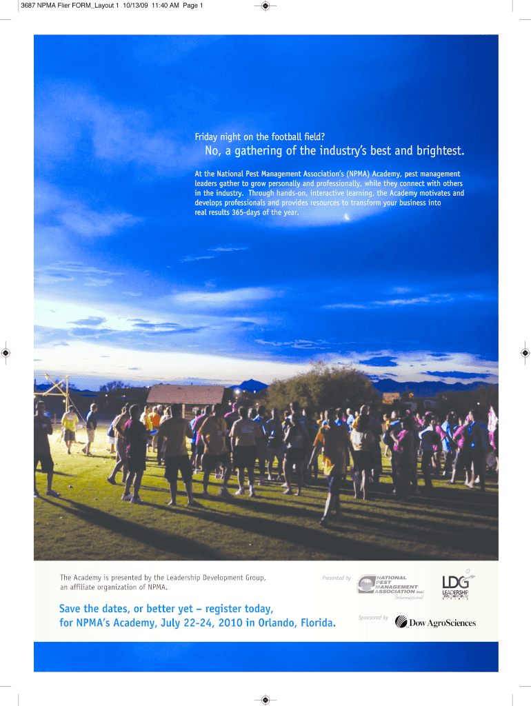 3687 NPA Flier FORM Layout 1 10×13/09 11:40 AM Page 1 Friday night on the football ELD? No, a gathering of the industries best and brightest. At the National Pest Management Associations (NPA) Academy,