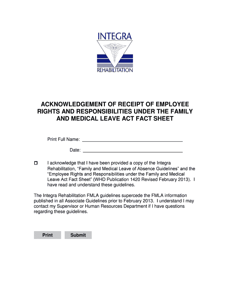 ACKNOWLEDGEMENT OF RECEIPT OF EMPLOYEE RIGHTS AND RESPONSIBILITIES UNDER THE FAMILY AND MEDICAL LEAVE ACT FACT SHEET Print Full Name: Date: I acknowledge that I have been provided a copy of the Integral