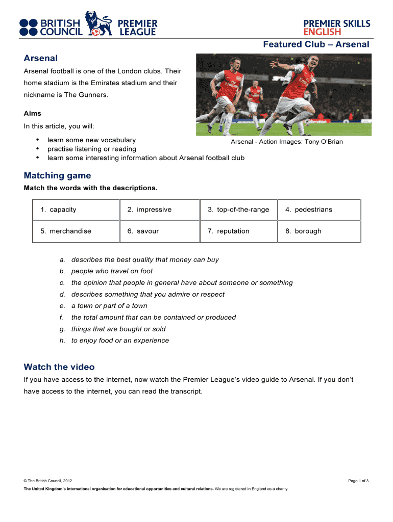 Featured Club Arsenal Arsenal Arsenal football is one of the London clubs. Their home stadium is the Emirates stadium and their nickname is The Gunners. Aims In this article, you will: learn some