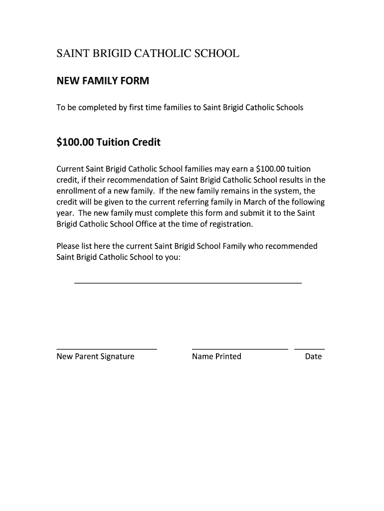 SAINT BRIGID CATHOLIC SCHOOL NEW FAMILY FORM To be completed by first time families to Saint Brigid Catholic Schools $100.00 Tuition Credit Current Saint Brigid Catholic School families may earn a