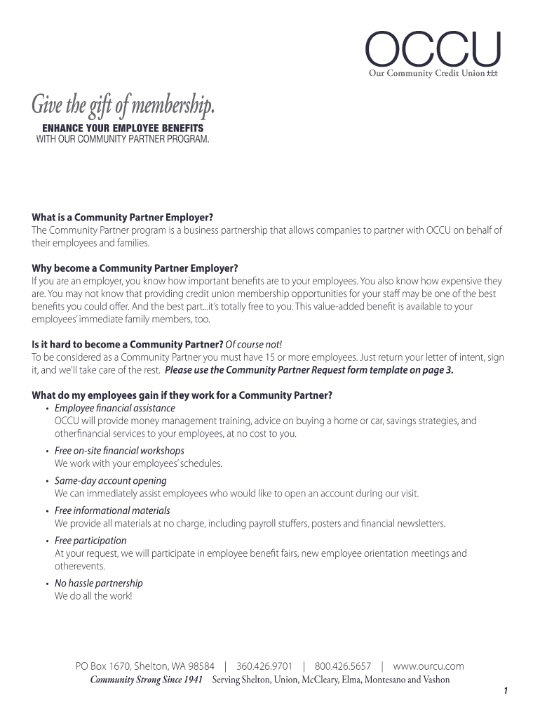 Give the gift of membership. ENHANCE YOUR EMPLOYEE BENEFITS WITH OUR COMMUNITY PARTNER PROGRAM. What is a Community Partner Employer? The Community Partner program is a business partnership that allows