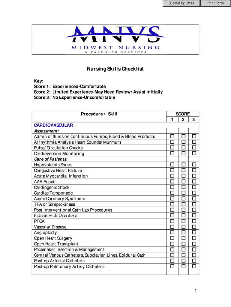 Submit By Email Print Form Nursing Skills Checklist Key: Score 1: ExperiencedComfortable Score 2: Limited Experience May Need Review×Assist Initially Score 3: No ExperienceUncomfortable Procedure