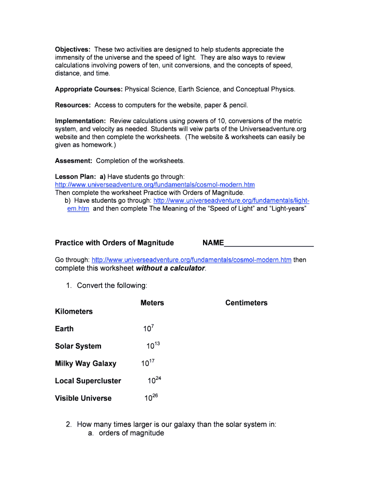 Objectives: These two activities are designed to help students appreciate the immensity of the universe and the speed of light. They are also ways to review calculations involving powers of ten, unit