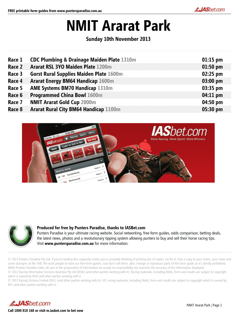 Get the NMIT Ararat Park Printable Form Guide - Sunday 10th November 2013. FREE Printable Horse R...