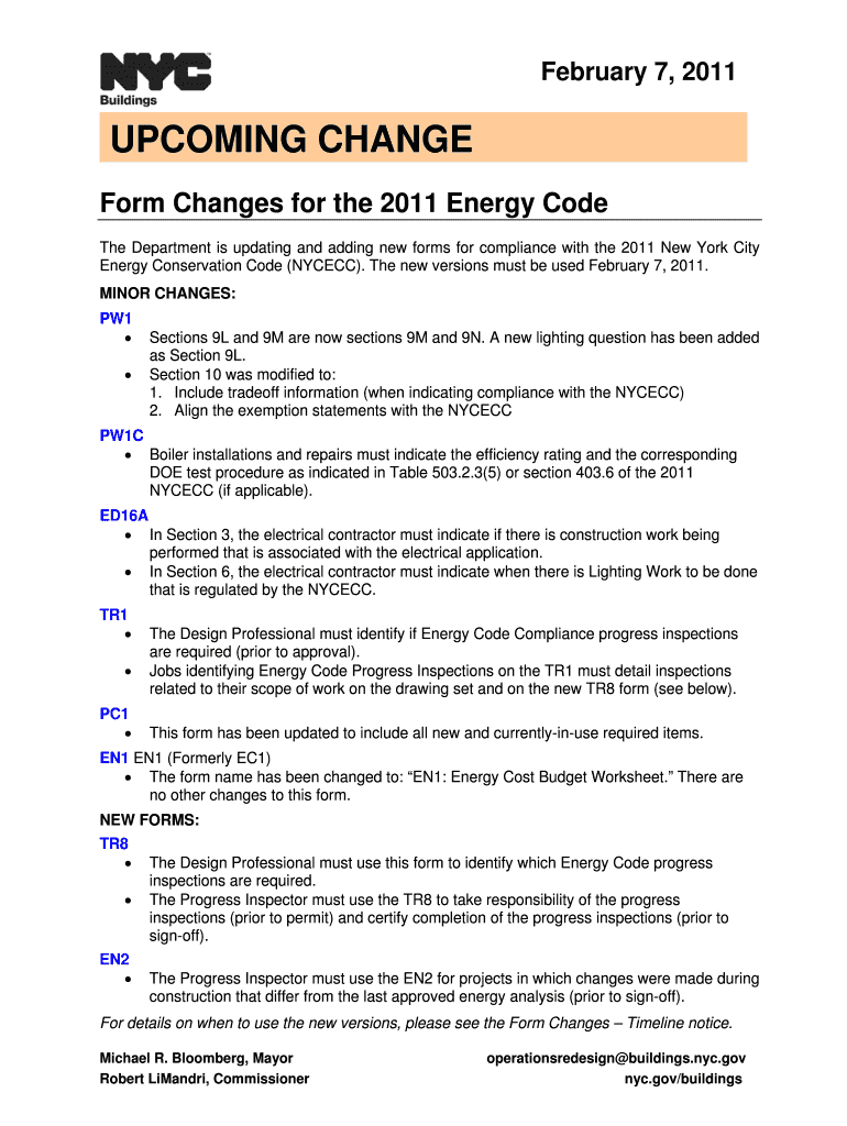 February 7, 2011, UPCOMING CHANGE Form Changes for the 2011 Energy Code The Department is updating and adding new forms for compliance with the 2011 New York City Energy Conservation Code (NYC ECC).