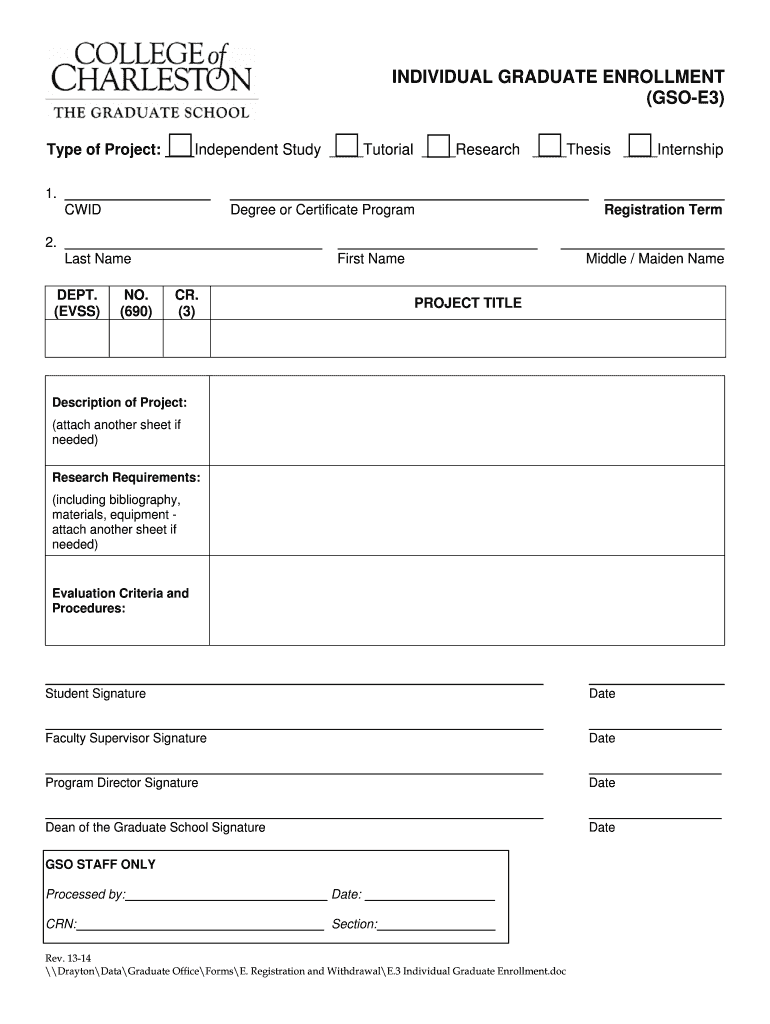 The Individual Graduate Enrollment Form (GSO-E3) serves as an essential document for graduate students engaging in independent study, thesis research, or other academic projects. This form provides a structured approach to formal enrollment, ensuring that all necessary parties are informed and accountable.