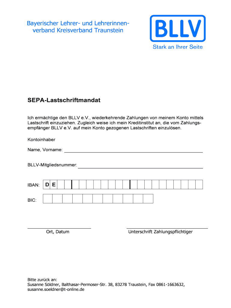 Bayerischer Leader UND Lehrerinnenverband Kreisverband Braunstein SEPALastschriftmandat ICH erectile den BLL e.V., wiederkehrende Harlingen on mane Onto mittens Lastschrift einzuziehen. Zurich was