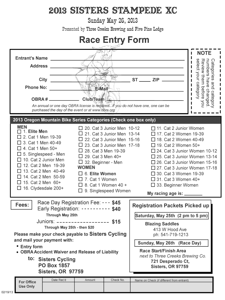 Sisters Stampede Sisters, Oregon Sunday, May 26, 2013, Race Entry Instructions To register for the 2013 Sisters Stampede: 1. Fill out the Entry Form on page 2 2. Fill out and sign the BRA Accident