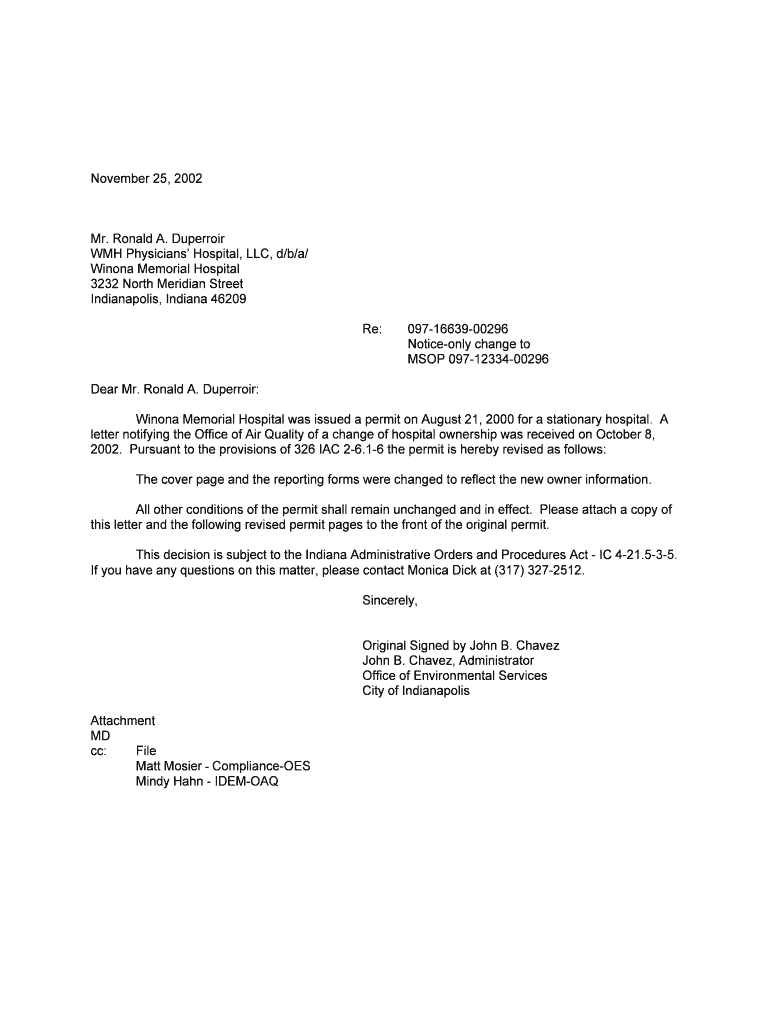 This document serves as a notice of a change in ownership for Winona Memorial Hospital and includes the details of the minor source operating permit issued by the Indiana Department of Environmental