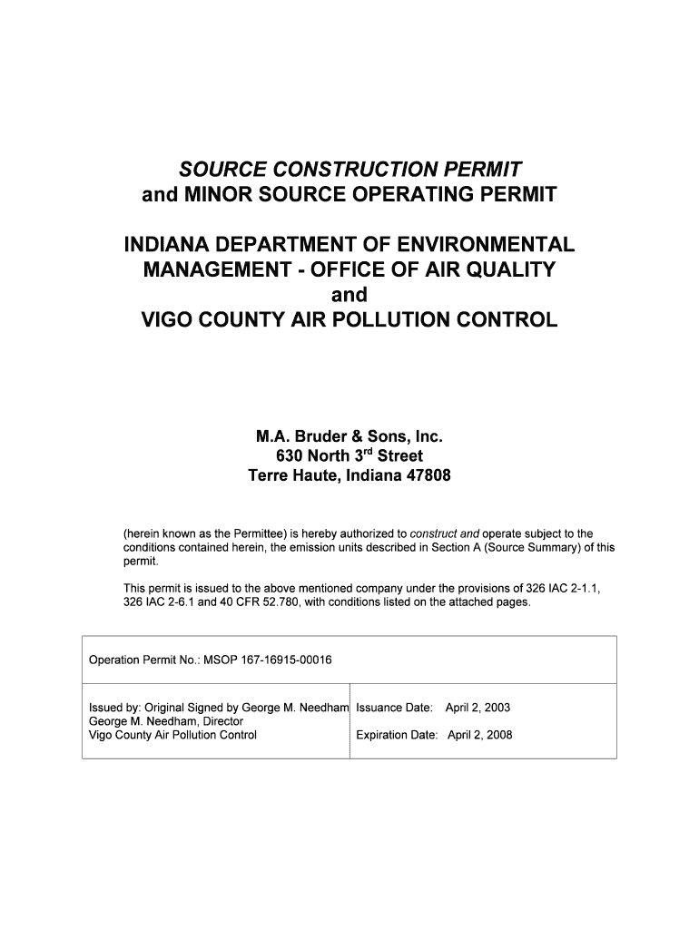 This document serves as a permit issued to M.A. Bruder & Sons, Inc. for the construction and operation of a paint manufacturing facility in Terre Haute, Indiana, detailing the conditions necessary