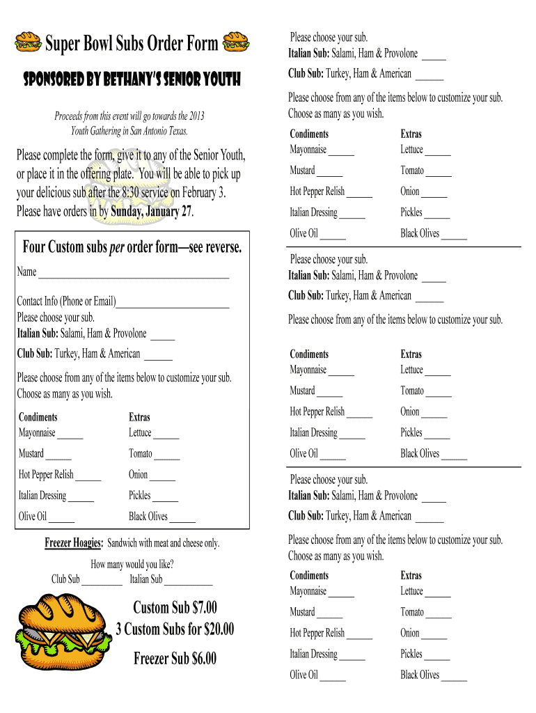 Super Bowl Subs Order Form Sponsored by Bethany's Senior Youth Proceeds from this event will go towards the 2013 Youth Gathering in San Antonio Texas. Please complete the form, give it to any of the