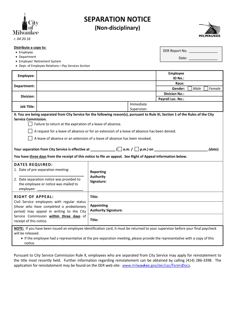 SEPARATION NOTICE (Nondisciplinary) r. 04 20.16 Distribute a copy to: HER Report No. Employee Department Employed Retirement System Dept. of Employee Relationship Services Section Date: Employee ID