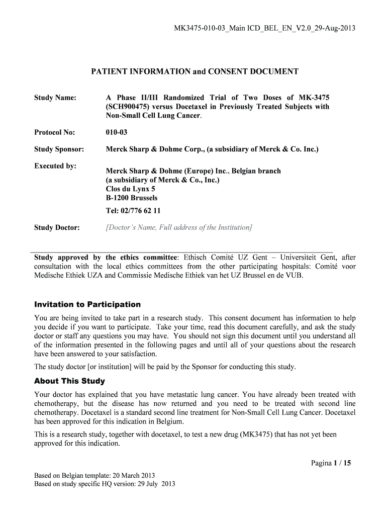MK347501003 Main ICD BE LEN V2.0 29Aug2013 PATIENT INFORMATION and CONSENT DOCUMENT Study Name: A Phase II×III Randomized Trial of Two Doses of MK3475 (SCH900475) versus Docetaxel in Previously Treated