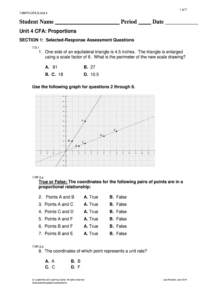 1 of 7 7.MATH.CFA. S. Unit 4 Student Name Period Date Unit 4 CFA: Proportions SECTION 1: SelectedResponse Assessment Questions 7. G.1 1. One side of an equilateral triangle is 4.5 inches. The triangle