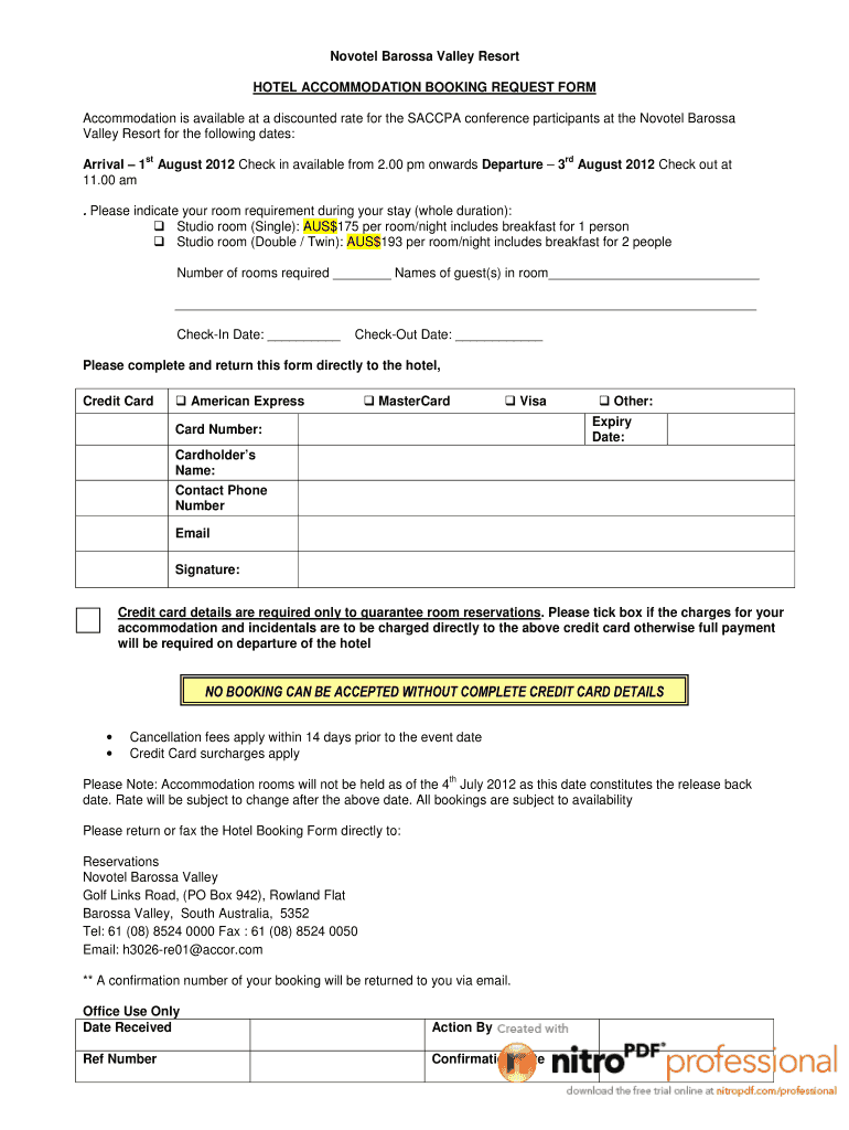 Novel Barons Valley Resort HOTEL ACCOMMODATION BOOKING REQUEST FORM Accommodation is available at a discounted rate for the SAC CPA conference participants at the Novel Barons Valley Resorts for the