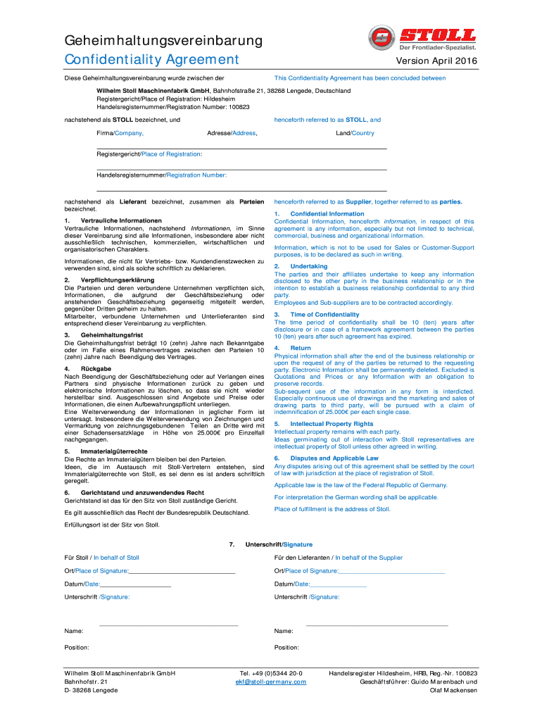 Get the free Geheimhaltungsvereinbarung Confidentiality Agreement - Stoll