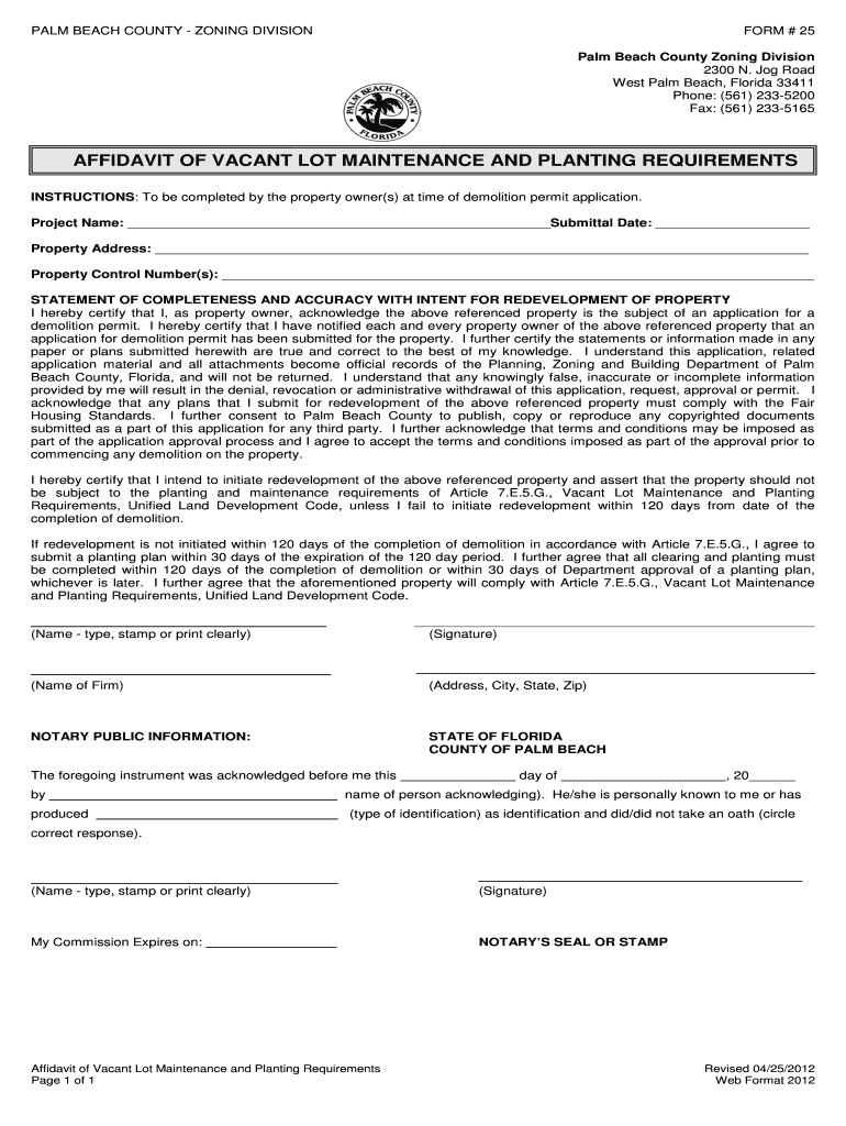 PALM BEACH COUNTY ZONING DIVISION FORM # 25 Palm Beach County Zoning Division 2300 N. Jog Road West Palm Beach, Florida 33411 Phone: (561× 2335200 Fax: (561× 2335165 AFFIDAVIT OF VACANT LOT MAINTENANCE