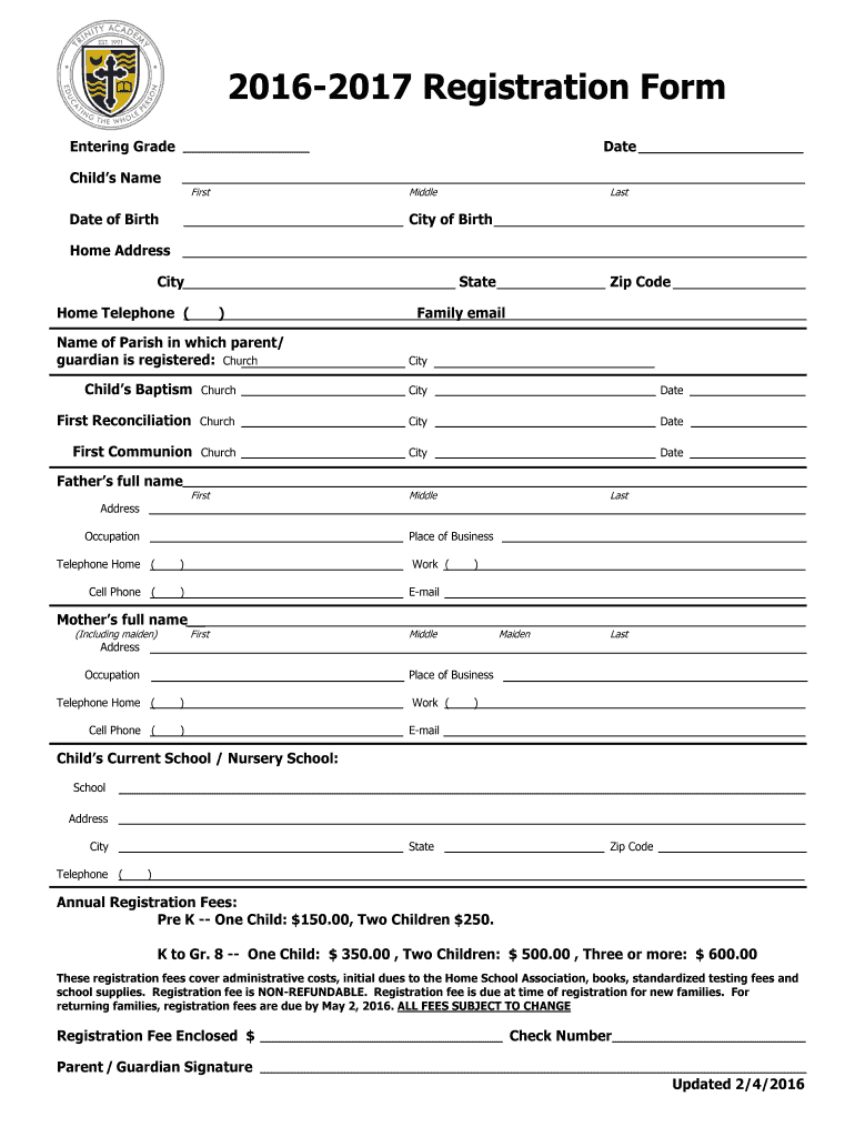 20162017 Registration Form Entering Grade Date Child's Name First Middle Date of Birth Last City of Birth Home Address City State Home Telephone () Name of Parish in which parent/ guardian is registered: