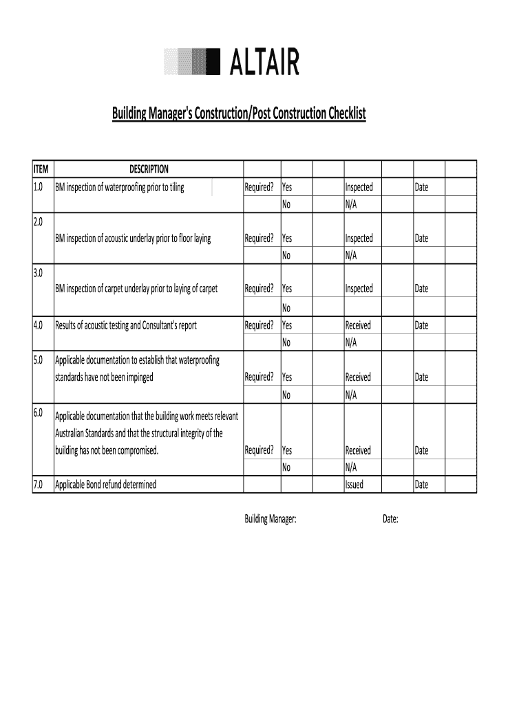 Building managers can fill out building managers constructionpost construction by documenting any issues or concerns that arise during the post-construction phase.
