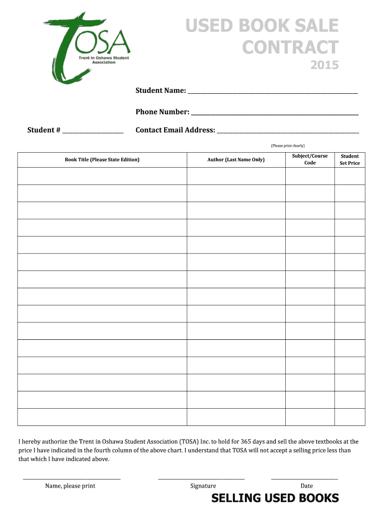 USED BOOK SALE CONTRACT 2015 Student Name: Phone Number: Student # Contact Email Address: (Please print clearly) Book Title (Please State Edition) Author (Last Name Only) Subject×Course Code Student