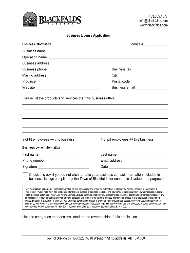 403.885.4677 info blackfalds.com www.blackfalds.com Business License Application Business Information License # Business name Operating name Business address Business phone Business fax Mailing address