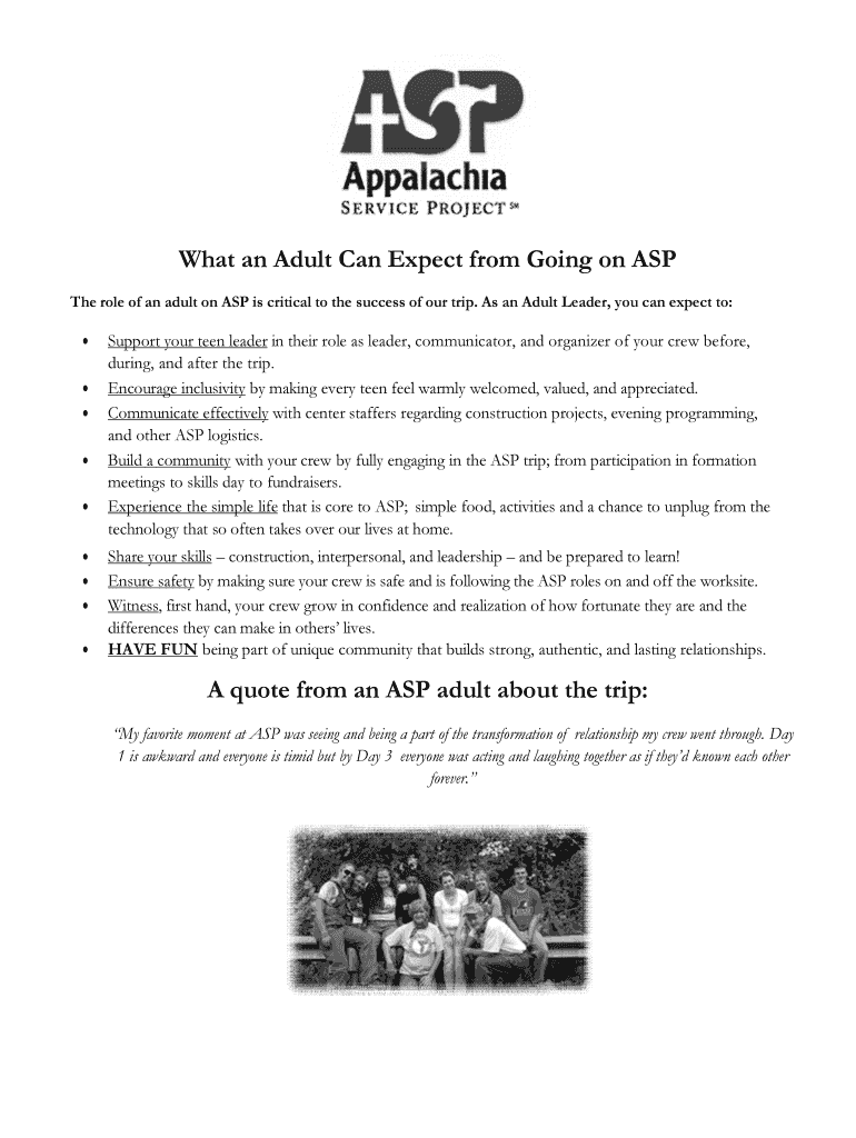 What an Adult Can Expect from Going on ASP The role of an adult on ASP is critical to the success of our trip. As an Adult Leader, you can expect to: Support your teen leader in their role as leader,