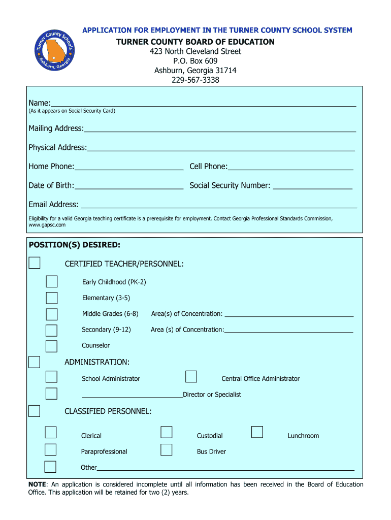 APPLICATION FOR EMPLOYMENT IN THE TURNER COUNTY SCHOOL SYSTEM TURNER COUNTY BOARD OF EDUCATION 423 North Cleveland Street P.O. Box 609 Ashburn, Georgia 31714 2295673338 Name: (As it appears on Social