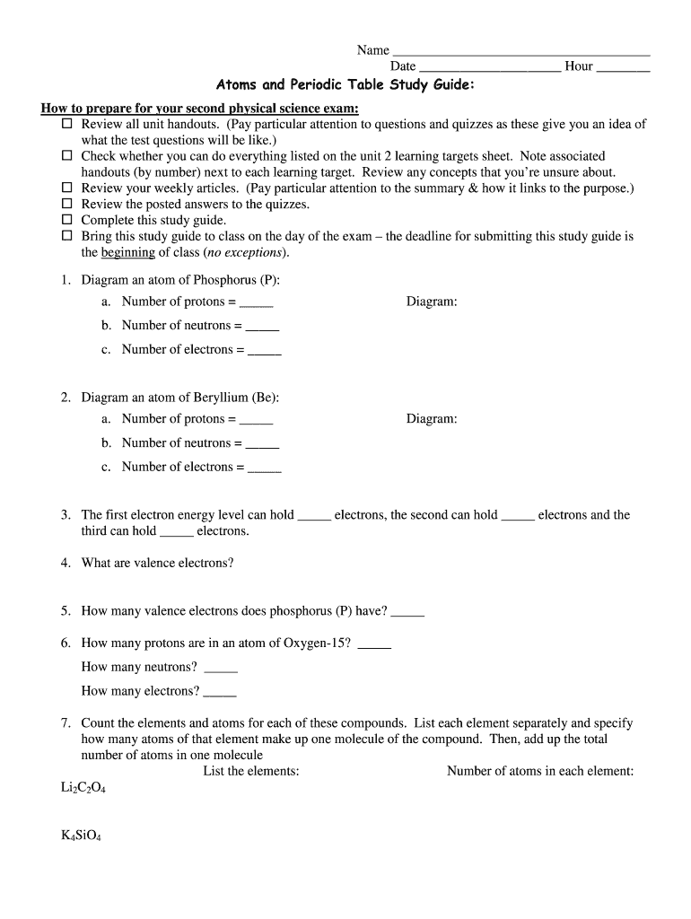 Name Date Hour Atoms and Periodic Table Study Guide: How to prepare for your second physical science exam: Review all unit handouts. (Pay particular attention to questions and quizzes as these give