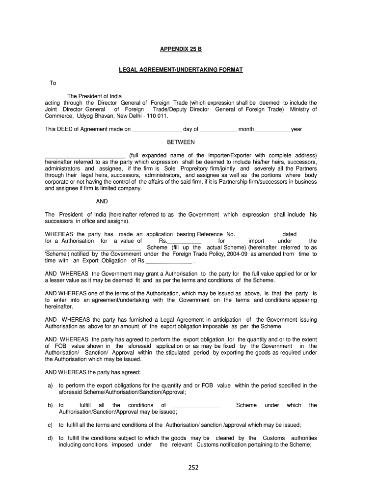 This document outlines the legal agreement/undertaking format for importers/exporters to comply with the terms and conditions laid down by the Government of India under the Foreign Trade Policy.