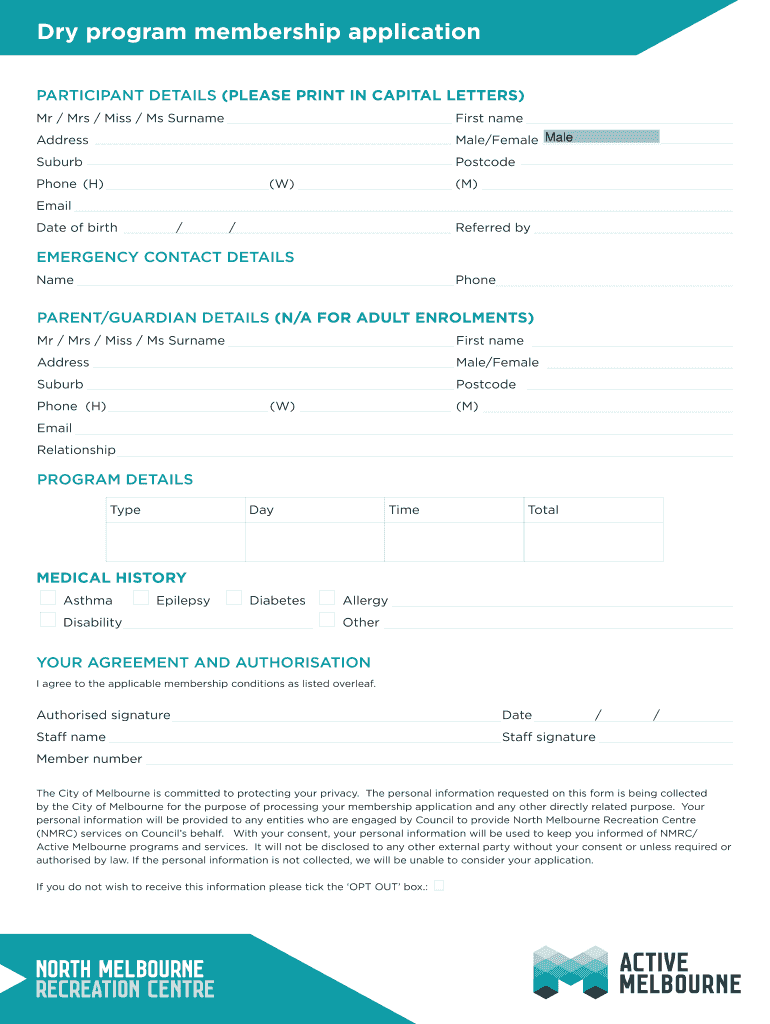 The Dry Program Membership Application is a personal form used by individuals to apply for membership at the North Melbourne Recreation Centre and provides required personal details.