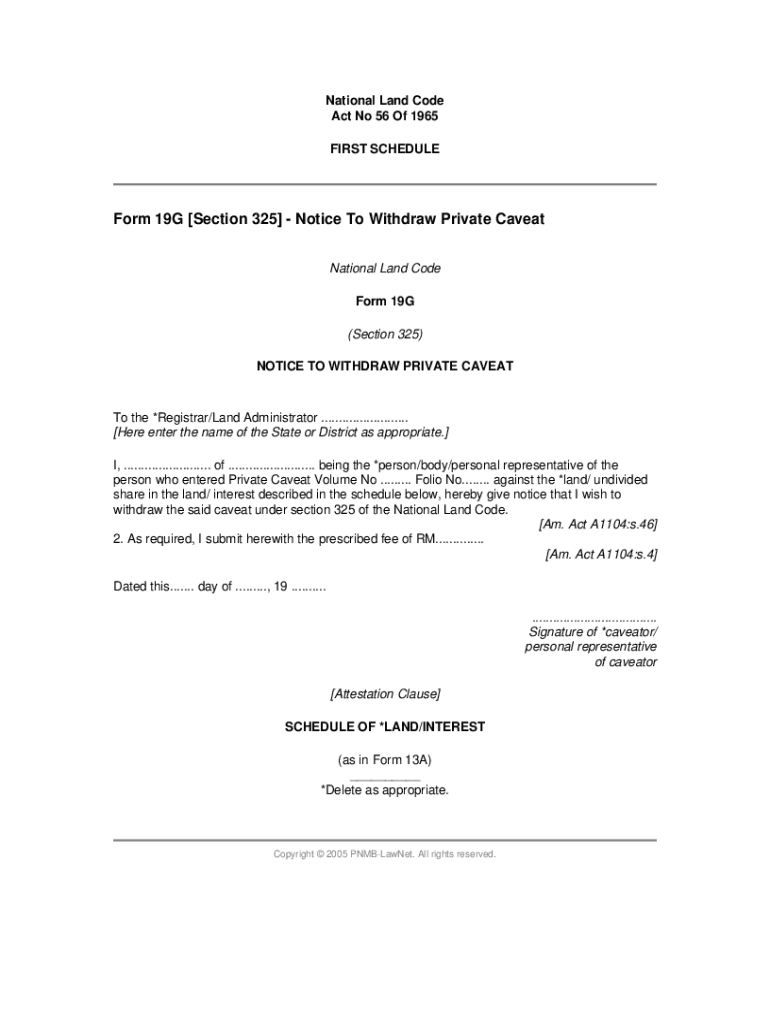 National Land Code Act No 56 Of 1965 FIRST SCHEDULE Form 19G Section 325 - Notice To Withdraw Private Caveat Form 19G Section 325 NOTICE TO WITHDRAW PRIVATE CAVEAT To the Registrar/Land Administrator. Here enter the name of the State or District as appropriate. I. of. being the person/body/personal representative of the person who entered Private Caveat Volume No. Folio No*. against the land/ undivided share in the land/ interest described in the schedule below hereby give notice that I wish...