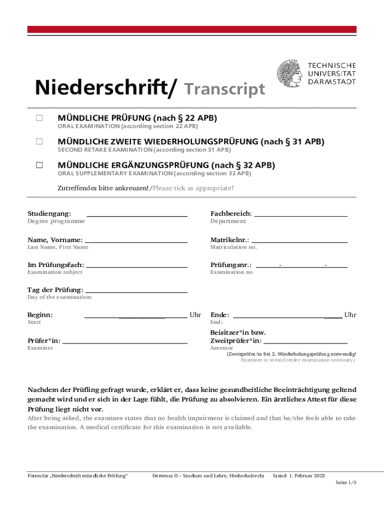 ORAL EXAMINATION (according section 22 APB)NICHE ZWE ITE WIEDERHOLUNGSPRFUNG (each 31 APB)