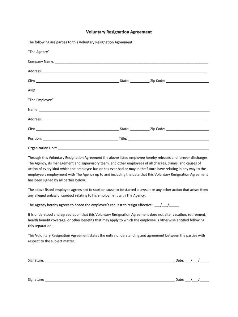 Employees who choose to resign from their position and their employer are required to file a voluntary resignation agreement.