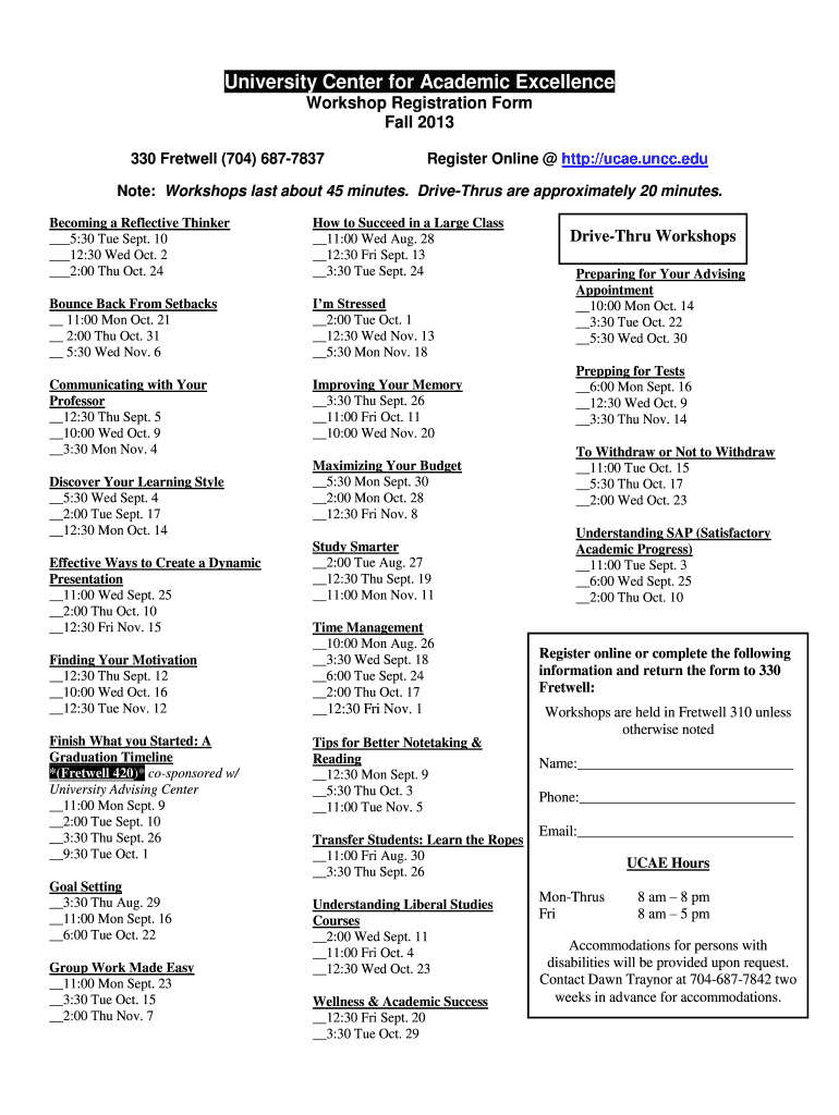 University Center for Academic Excellence Workshop Registration Form Fall 2013 330 Fret well (704× 6877837 Register Online HTTP://UCA.UNC.edu Note: Workshops last about 45 minutes. Drivers are approximately