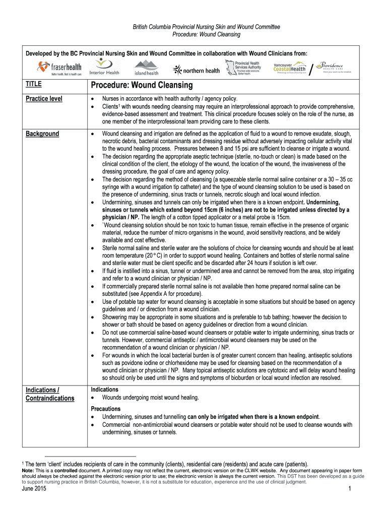 British Columbia Provincial Nursing Skin and Wound Committee Procedure: Wound Cleansing Developed by the BC Provincial Nursing Skin and Wound Committee in collaboration with Wound Clinicians from: