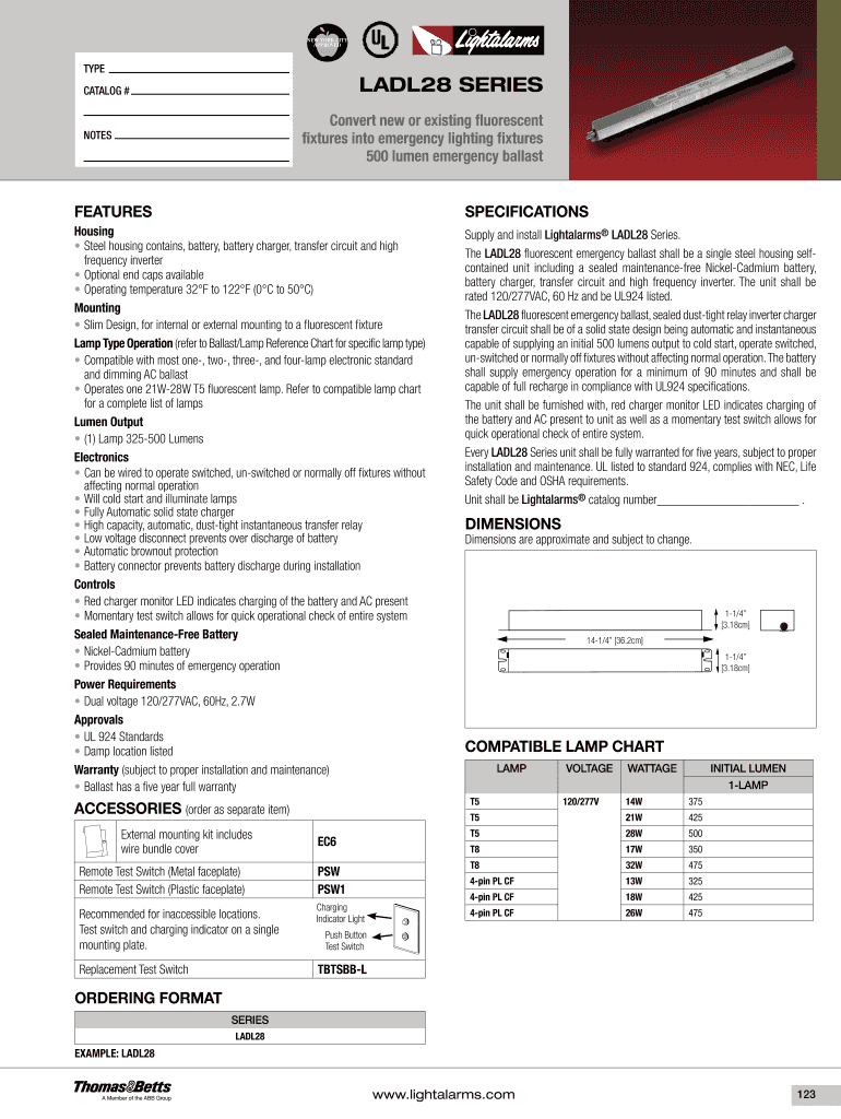 TYPE LADL28 SERIES CATALOG # Convert new or existing fluorescent fixtures into emergency lighting fixtures 500 lumen emergency ballast NOTES FEATURES SPECIFICATIONS Housing Steel housing contains,