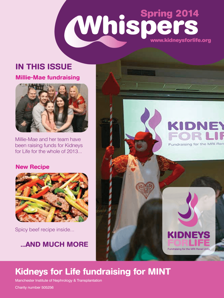 Spring 2014 Whispers www.kidneysforlife.org IN THIS ISSUE Millie Mae fundraising Millie Mae and her team have been raising funds for Kidneys for Life for the whole of 2013... New Recipe Spicy beef