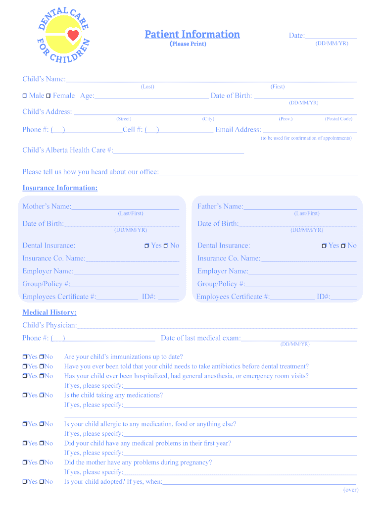 Get the free Patient Information Date DDMMYR - Dental Care For - dentalcareforchildren