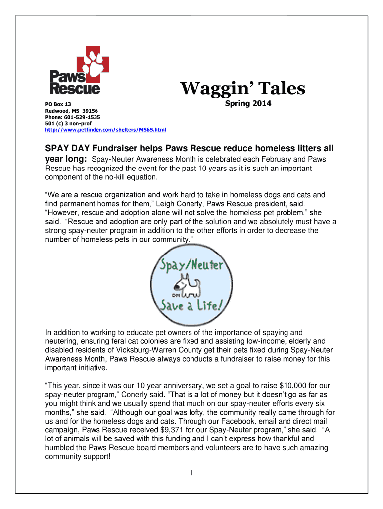 Wagging Tales Spring 2014 PO Box 13 Redwood, MS 39156 Phone: 6015291535 501 ×c× 3 nonprof HTTP://www.petfinder.com×shelters×MS65.html SPAY DAY Fundraiser helps Paws Rescue reduce homeless litters
