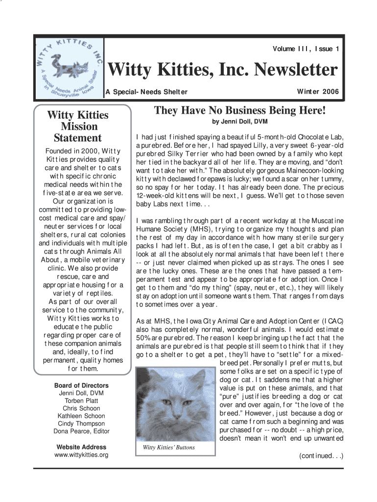 Witty Kitties, Inc. Newsletter Winter 2006 Volume III, Issue 1 Witty Kitties, Inc. Newsletter Winter 2006 A Specialized Shelter Witty Kitties Mission Statement Founded in 2000, Witty Kitties provides