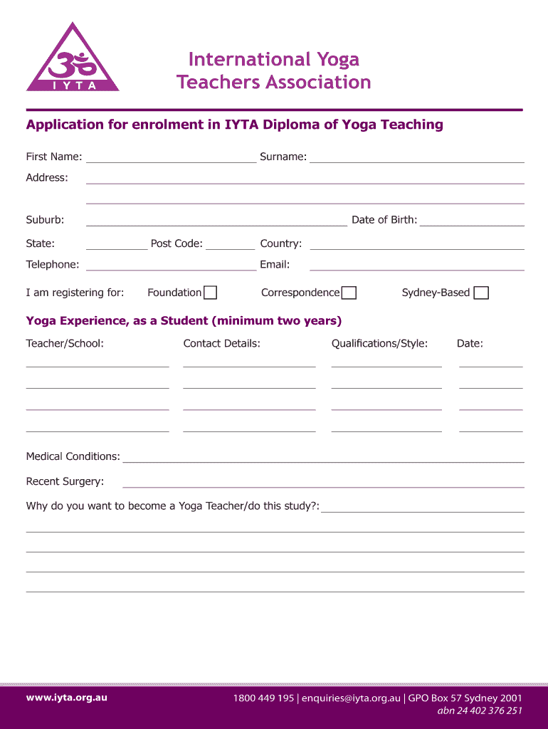 Get the free Application for enrolment - International Yoga Teachers Association - iyta org