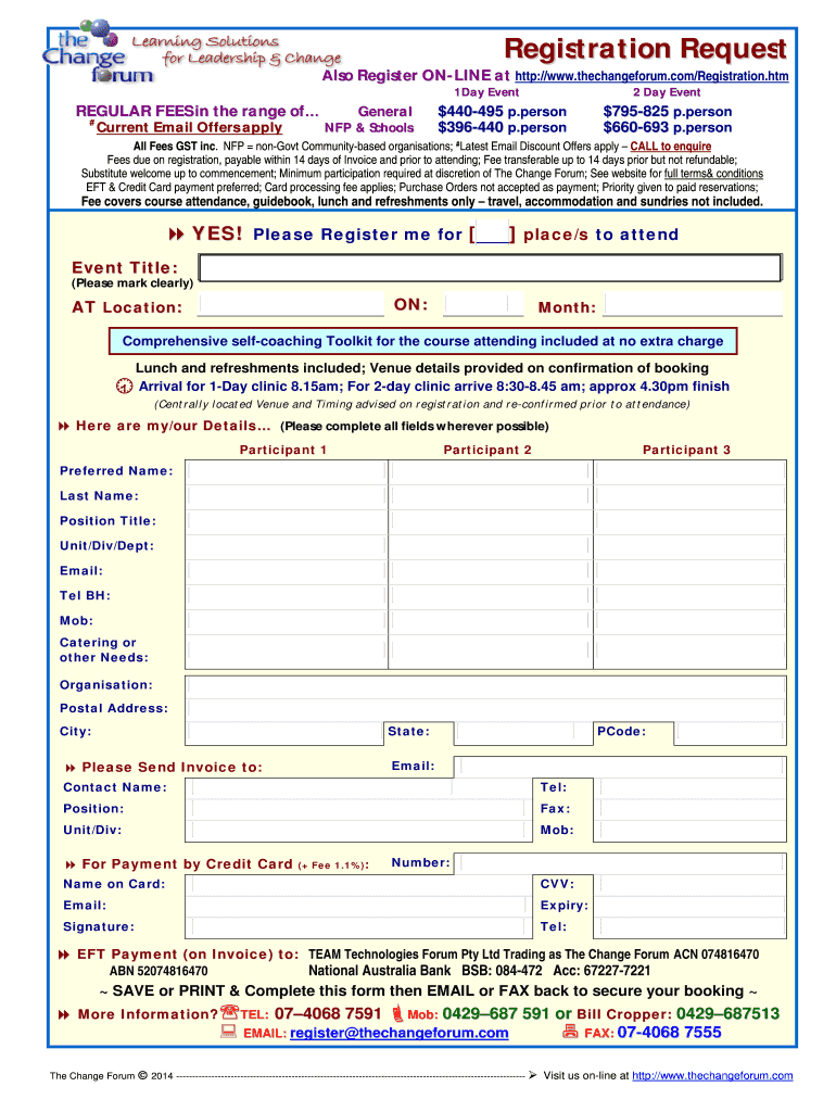 Registration Request Also Register ONLINE at HTTP://www.thechangeforum.com×Registration.htm 1-Day Event REGULAR FEES in the range of # Current Email Offers apply General NFL & Schools 2-Day Event