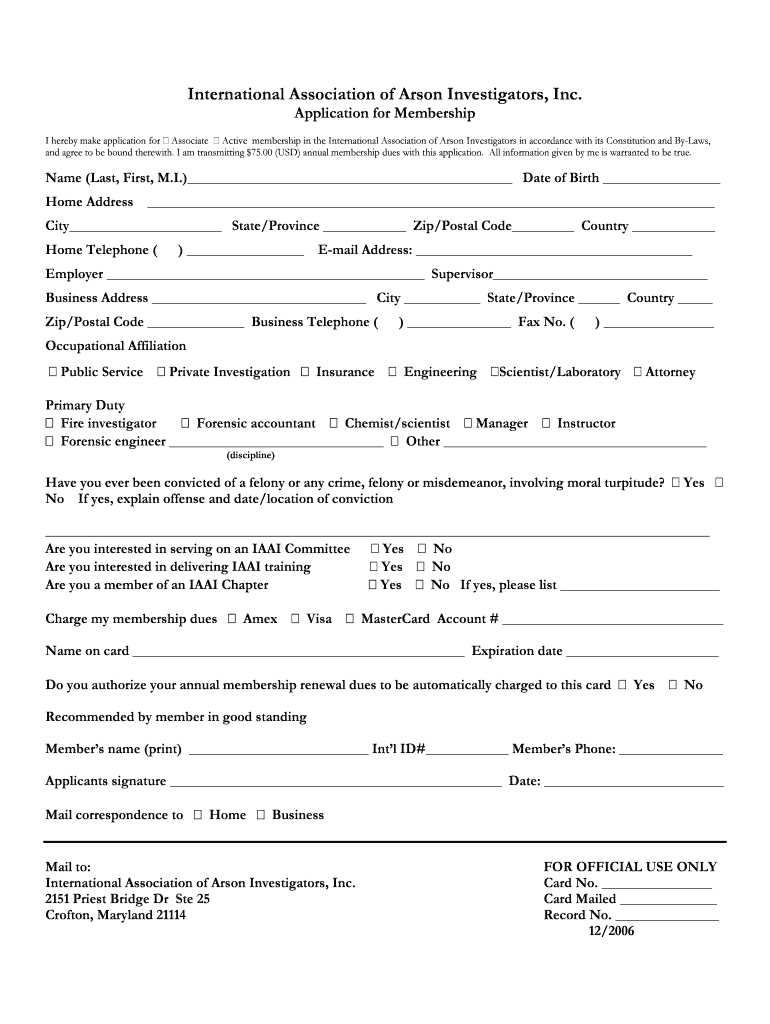 International Association of Arson Investigators, Inc. Application for Membership I hereby make application for Associate Active membership in the International Association of Arson Investigators