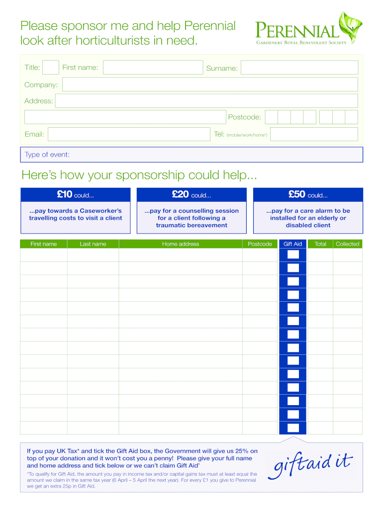 Please sponsor me and help Perennial look after horticulturists in need. Title: First name: Surname: Company: Address: Postcode: Tel: (mobile×work×home*) Email: Type of event: Here show your sponsorship