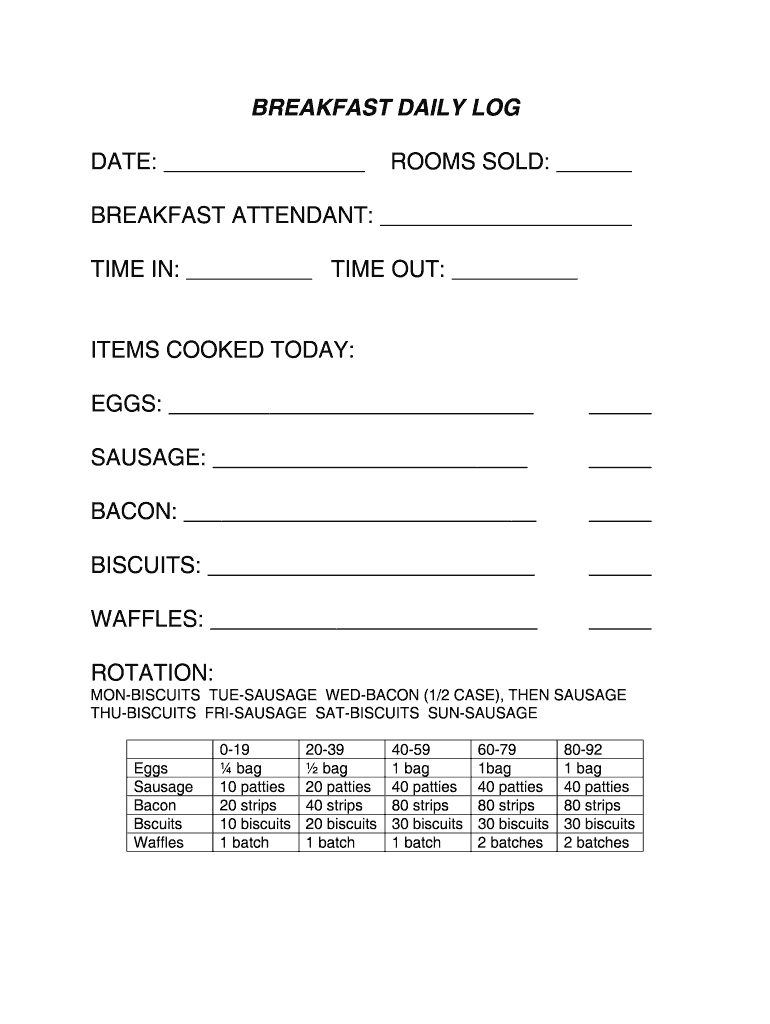 Breakfast daily log date: rooms sold: breakfast attendant: time in: time out: items cooked today:
