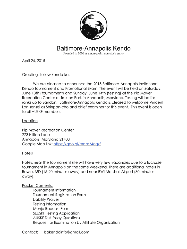 Baltimore Annapolis Kendo Founded in 2006 as a nonprofit, nonstick entity April 24, 2015, Greetings fellow Mendoza, We are pleased to announce the 2015 Baltimore Annapolis Invitational Kendo Tournament