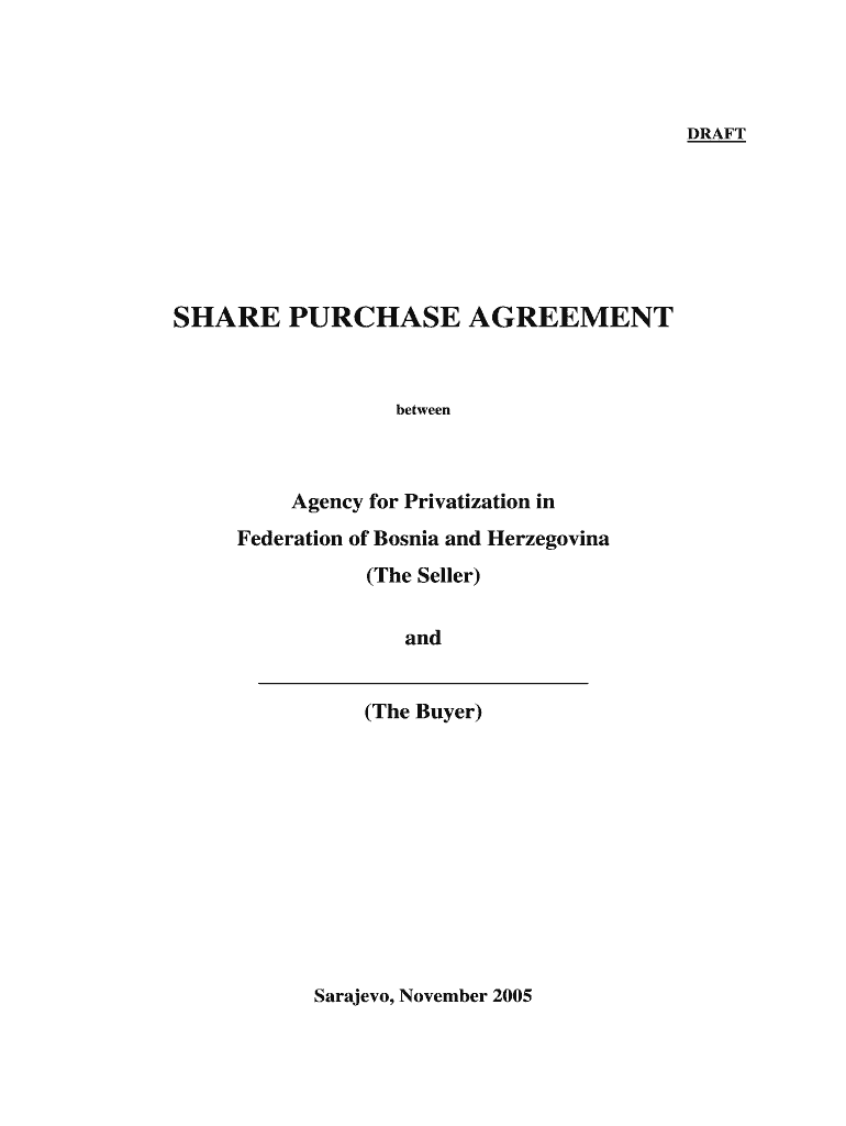 DRAFT SHARE PURCHASE AGREEMENT between Agency for Privatization in Federation of Bosnia and Herzegovina (The Seller) and (The Buyer) Sarajevo, November 2005 The Share Purchase Agreement, entered into