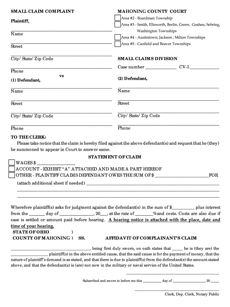 SMALL CLAIMS INFORMATION FOR FILING MEDIATION Prior to the filing of your small claim the Court recommends that you attempt to resolve the matter by utilizing the services of Mahoning Valley Dispute