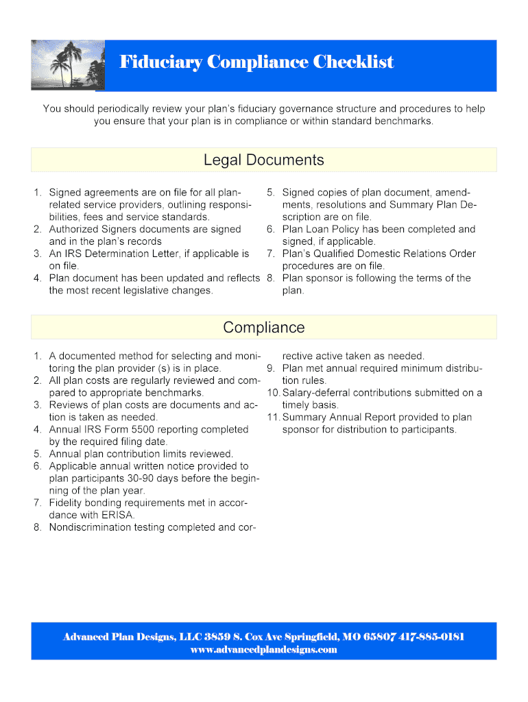 Fiduciary Compliance Checklist You should periodically review your plans fiduciary governance structure and procedures to help you ensure that your plan is in compliance or within standard benchmarks.