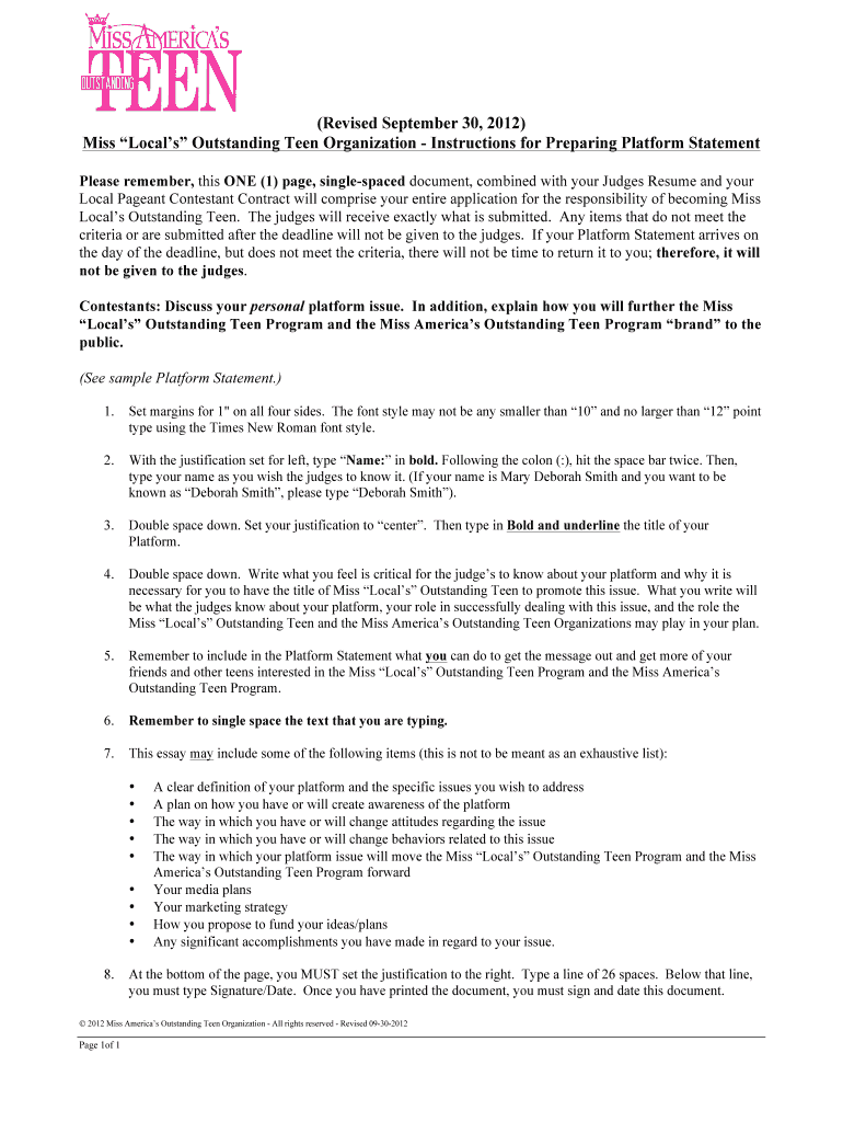 (Revised September 30, 2012) Miss Locals Outstanding Teen Organization Instructions for Preparing Platform Statement Please remember, this ONE (1) page, single spaced document, combined with your